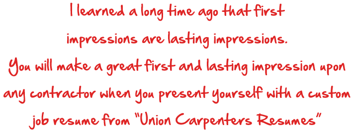 There has never been a job resume service for union carpenters like this until now. And with open solicitation, it’s a perfect match. The price is very reasonable, very affordable, and absolutely cost effective and I provide a quick, unmatched service level because the union carpenter is all I’m here for.