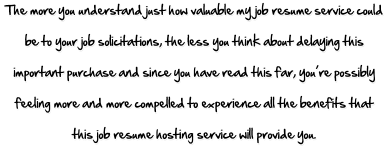 You simply subscribe to my service and my resume template that is customized and hosted just for you on my exclusive site. You simply add all your pertinent content and information and your resume is ready to go to work for you 24/7. Let me paint you a hypothetical picture as an example of the point I’m trying to make to you.